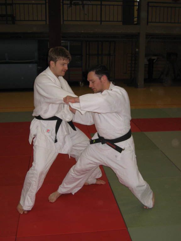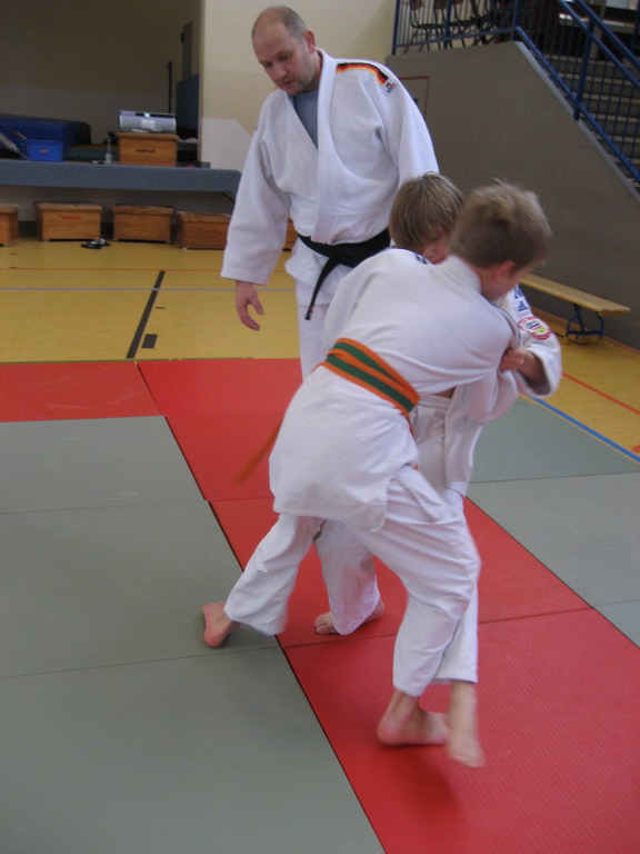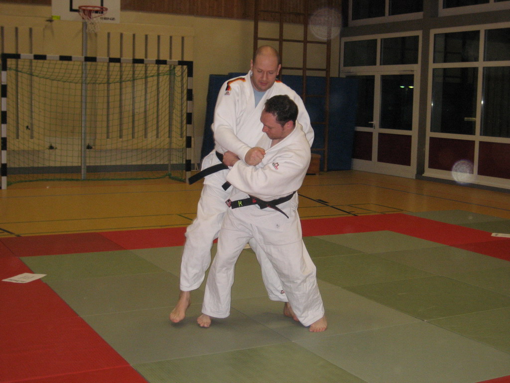 Steffen Makowski, langjähriger Oberliga- und Regionalligakämpfer, zeigte nach spielerischer Erwärmung seine Spezialtechnik Seoi-nage mit unterschiedlichen Griffvarianten, Platzwechseln links wie rechts, sowie vor- und nachbereitende Techniken dazu. Beeindruckt versuchten Alle, Steffen nachzueifern und übten die Techniken. Zum Abschluss der ersten Einheit gab es eine halbe Stunde Zeit, die neuen Tricks im Randori auszuprobieren.