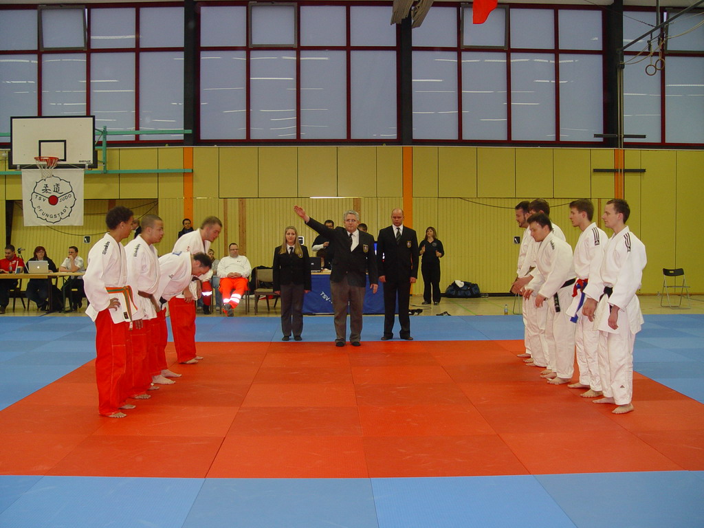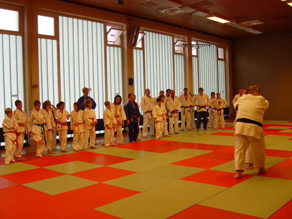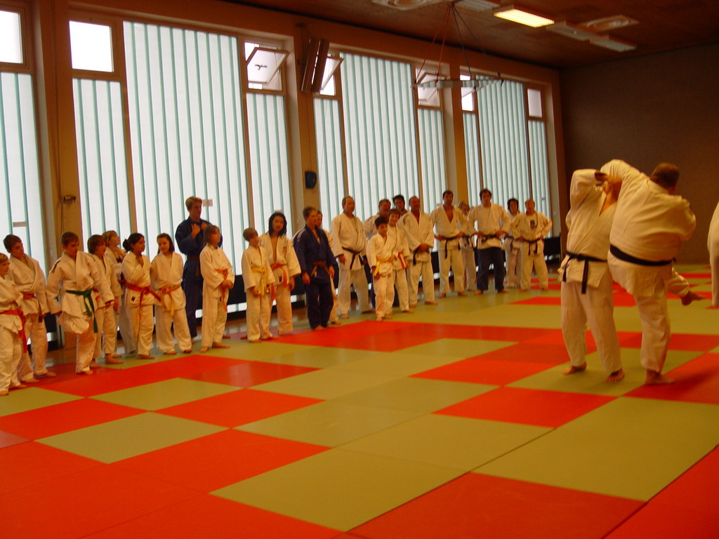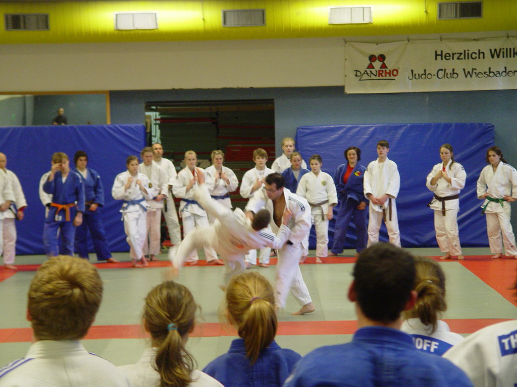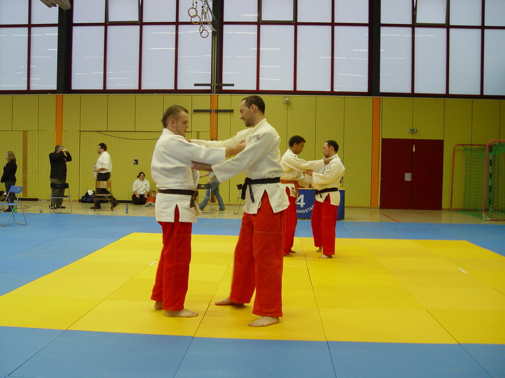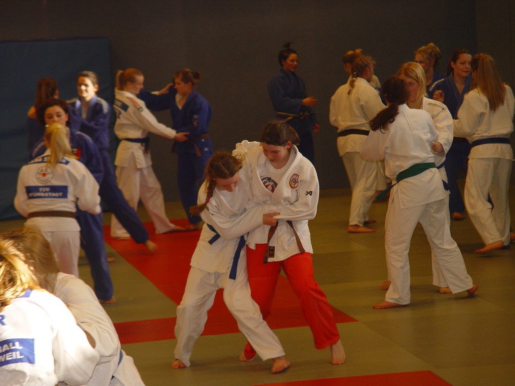 Die hessischen Judoka hatten sogar eine halbe Stunde länger Training, denn sie mussten schon um 13.30 Uhr wieder erscheinen. Bis zum offiziellen Beginn der zweiten Trainingseinheit um 14.00 Uhr gab es dann ein paar Einweisungen in Spezialtechniken vom hessischen Landestrainer Jan Steiner, die dann geübt wurden.