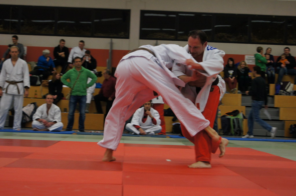 Kurz vor 16.00 Uhr startete dann endlich auch Steffen Makowski in dem größten Teilnehmerfeld in der Klasse -81 kg. An diesem Tag lies der Betreuer der Kämpfer des TV Gladenbach es sich nicht nehmen, selber auch noch Mal auf die Matte zu gehen. Gleich zu Beginn wartete dann ein ganz großer Brocken von der HTG Bad Homburg, Felix Ernst. Gegen den Bundesligakämpfer und späteren Hessenmeister konnte Steffen den Kampf zu Beginn noch ausgeglichen halten, ehe Ernst sich nach knapp zwei Minuten Kampfzeit mit einem Uchi-mata durchsetzte.